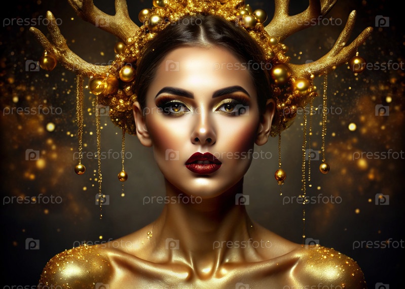 Творческий баннер для салона красоты в черно-золотых тонах. Профессиональный макияжный художник, стилист и парикмахер. Красивая женщина с вечерним гримом и золотыми рогами на голове. Индустрия красоты