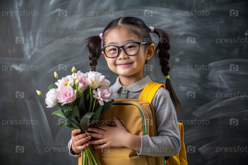 Первоклассный азиат с очками на доске. Девушка держит цветы в руках. Ребенок пойдет в школу впервые. Ребёнок с рюкзаком, книгой и цветами. Возвращение к школе