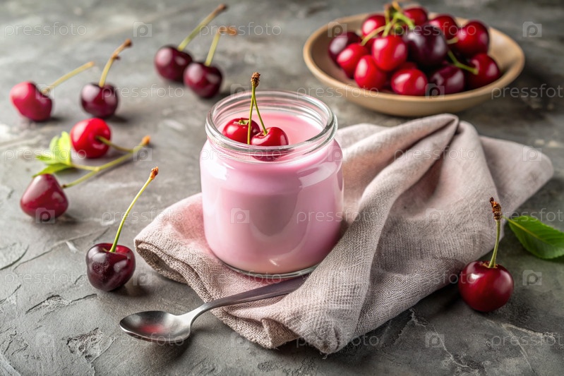 Домашний вишневый йогурт со свежими ягодами, старинной ложкой и полотенцем на стильном сером фоне