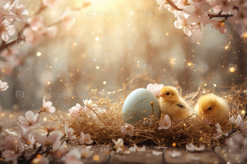 Концепция яркого Пасхального праздника. Нежные розовые пасхальные яйца, желтые курицы и вишневые ветви на деревянном фоне. Концепция ярких пасхальных праздников в 2026 году