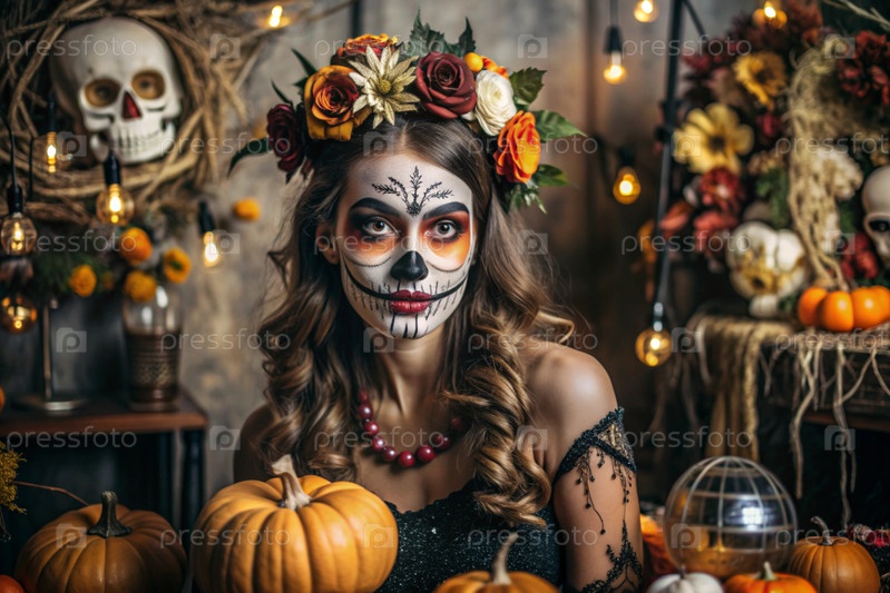 Концепция Хэллоуина. Ужасно. Костюмированная вечеринка. Красивая женщина с покрашенным черепом на лице и цветами на голове. Баннер, открытка
