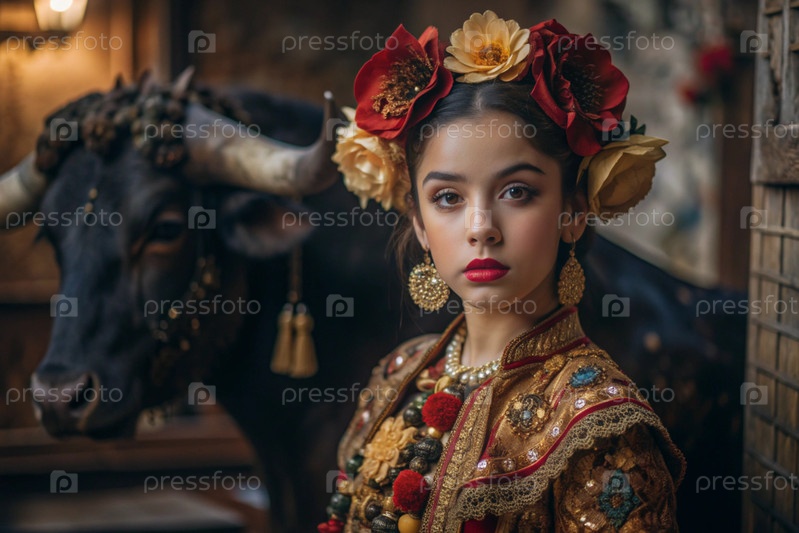 Испанская девушка в традиционном испанском национальном костюме. Перед быком. Бикоборство. Портрет символизирует традиции и культуру народа Испании