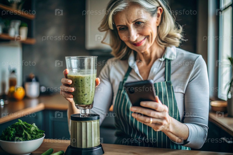 Пожилая женщина на кухне смотрит на рецепты здоровой пищи по телефону и готовит овощный коктейль из брокколи в блендере