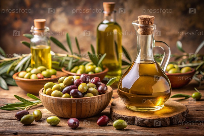 Оливковое масло в красивой бутылке со свежими маслинами и цветущими оливковыми ветвями на бежевом фоне
