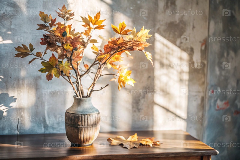 Ветви с золотыми осенними листьями в керамической вазе на деревянном столе у окна. Концепция домашнего комфорта. Осенний декор для Хэллоуина