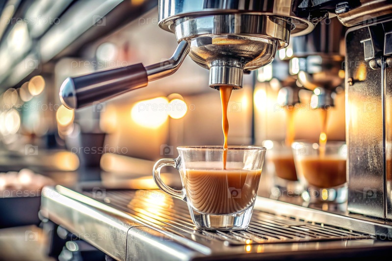 Свежеваренный кофе, заливаемый из кофейной машины на размытом фоне кафе или ресторана