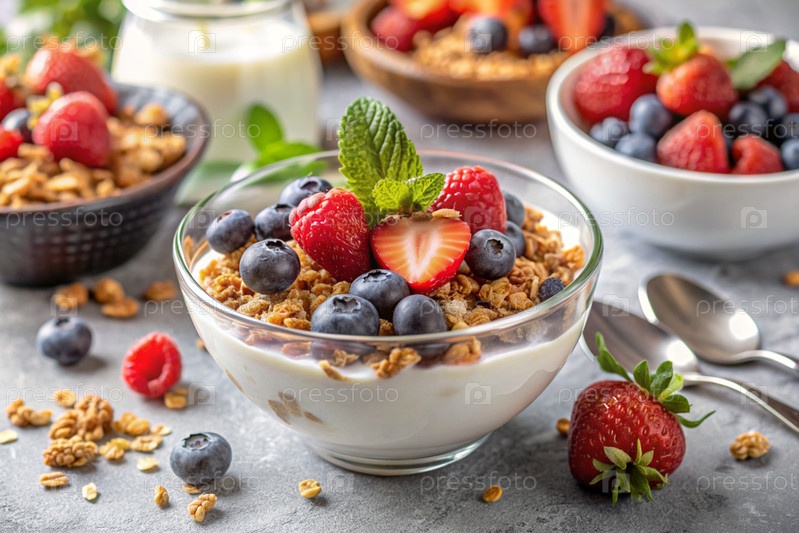 миска домашнего йогурта, мусли, ягод и орехов. здоровый и вкусный завтрак. доброе утро