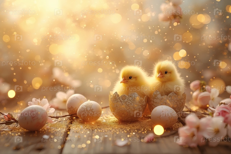 Концепция яркого Пасхального праздника. Нежные розовые пасхальные яйца, желтые курицы и вишневые ветви на деревянном фоне. Концепция ярких пасхальных праздников в 2026 году