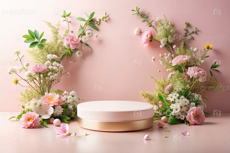 Минималистский розовый пастельный фон для демонстрации продукта.Современная подиум с розовой стеной и цветами вокруг.Креативный дизайн презентации продукции