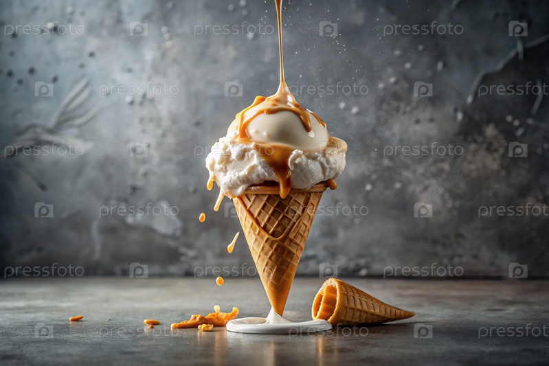 сладкий холодный десерт кремовый ванильный мороженое с карамелем баннер реклама любовь к мороженому
