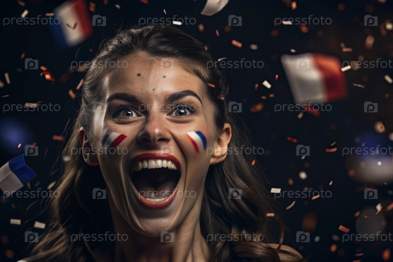 Красивая спортсменка или чирлидер из Франции с радостными криками после победы на Олимпийских играх на фоне французского флага