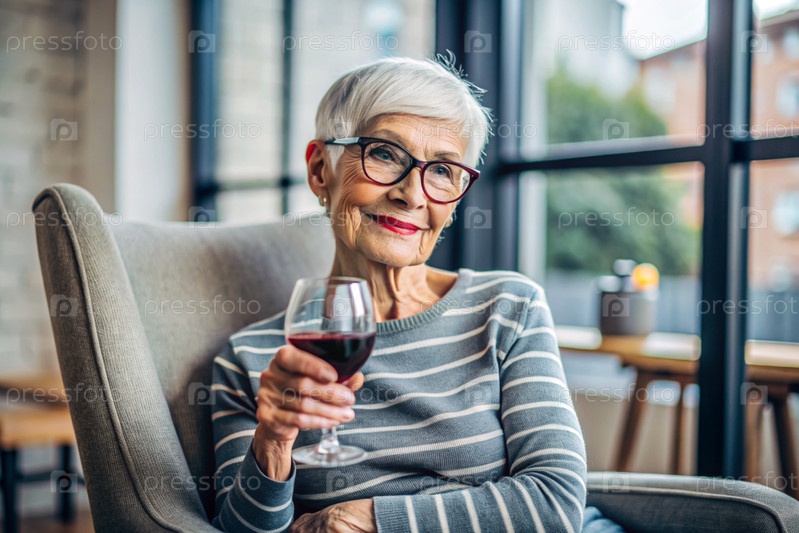 Современная, стильная пожилая женщина с короткими волосами со стаканом красного вина на стуле в гостиной дома