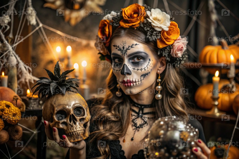 Концепция Хэллоуина. Ужасно. Костюмированная вечеринка. Красивая женщина с покрашенным черепом на лице и цветами на голове. Баннер, открытка