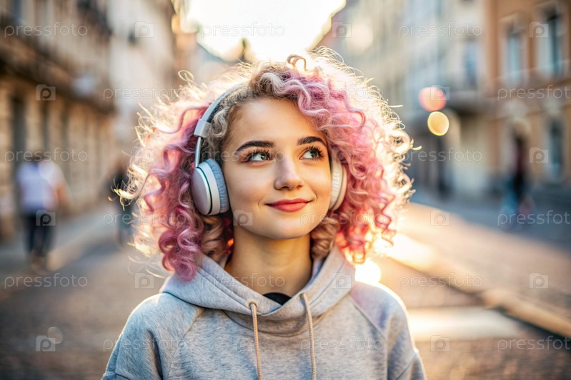 Молодая красивая кудрявая женщина с розовыми волосами слушает музыку на наушниках на вечерней улице города.Мир, гармония, отдых и расслабление
