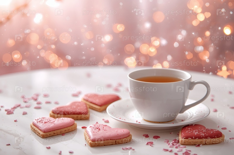 Домашнее имбирное печенье в форме сердца и чашка чая на столе. вкусный имбирный кекс в форме сердца на светло-розовом фоне. свежевыпеченный имбирный кекс на День святого Валентина
