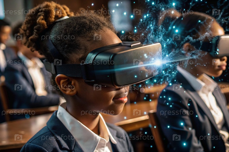 Чернокожая африканская девушка с очками виртуальной реальности.Ребенок находится в классе, а другие ученики на заднем плане.Цифровой интерфейс отображается в наушниках