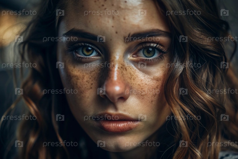 Глубокий эмоциональный портрет. Лицо молодой девушки без макияжа с выразительными глазами и кудрявыми коричневыми волосами. Естественная женская красота