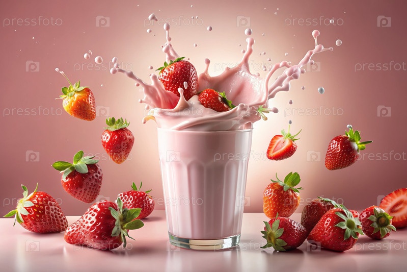 Творческий кулинарный рисунок. ближайшее наполнение клубники, клубника в стакане молока, розовый милкшейк, коктейль йогурта с жидкими каплями на розовом фоне