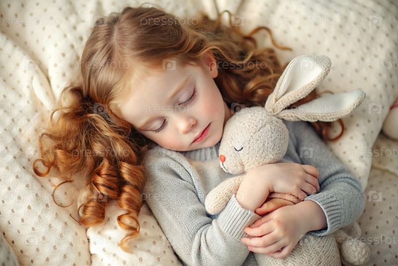 Маленькая девочка с длинными волосами и веснушками спит в своей постели, обнимая плюшевого кролика