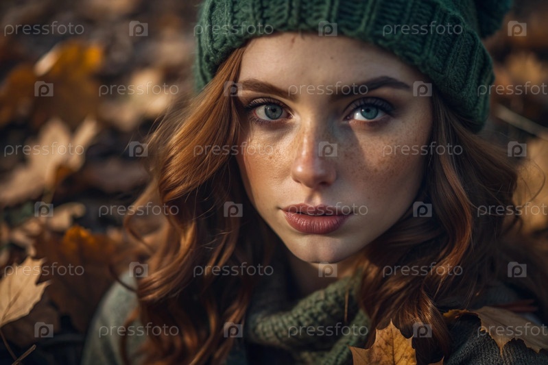 Осенний портрет. Близкий план молодой рыжеволосой женщины с выразительными зелеными глазами в вязанной шляпе и свитере