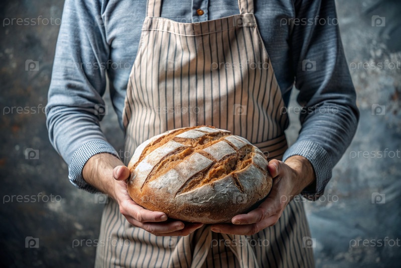 Свежий вкусный хлеб в руках пекаря-мужчины на близком расстоянии. свежевыпеченный кислый хлеб с золотой корой. пекарня со вкусным хлебом. кондитерские изделия