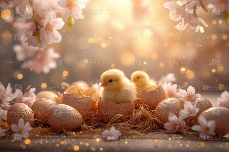 Концепция яркого Пасхального праздника. Нежные розовые пасхальные яйца, желтые курицы и вишневые ветви на деревянном фоне. Концепция ярких пасхальных праздников в 2026 году
