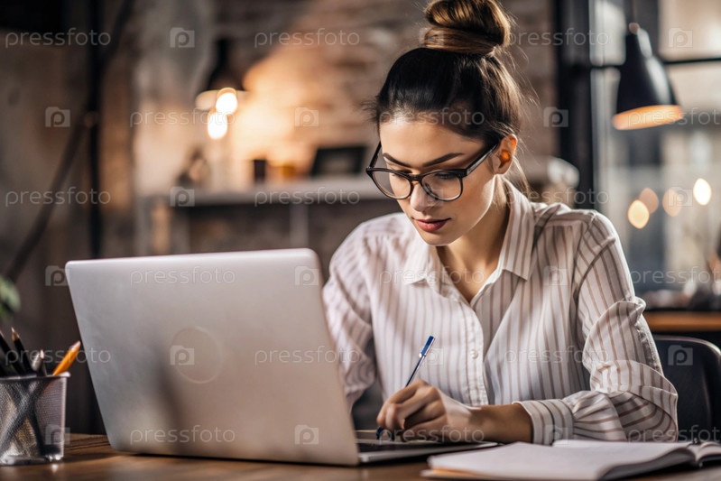 Молодая женщина фрилансер в очках и наушниках работает на ноутбуке или делает покупки в интернет-магазине