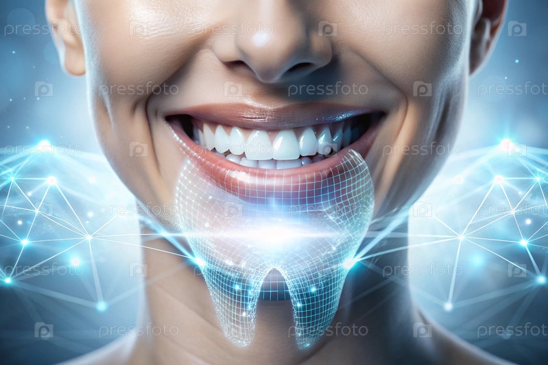 Новые технологии в протезировании зубов. Имплантаты. Улыбающаяся женщина со здоровой, идеальной улыбкой. Концепция стоматологического здоровья и ухода за зубами