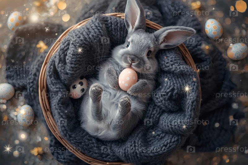 Пасхальный кролик держит пасхальное яйцо в лапах, лежит на спине на сером вязанном одеяле и смотрит в камеру