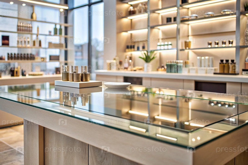 Минимальный фон для демонстрации продукта. Современная стеклянная подиум в современном магазине косметики. Элегантный дизайн для презентации косметической продукции
