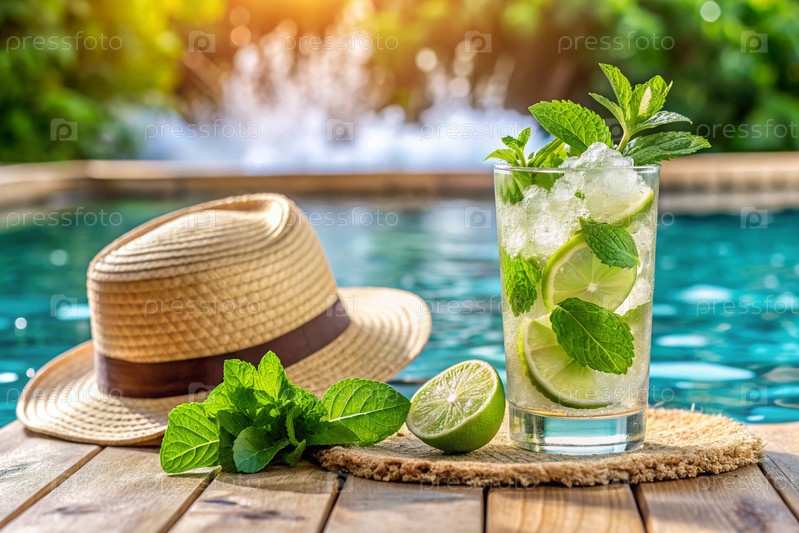 Коктейль алкоголя сочные фрукты с кубиками льда и нарезами лимона, лайма и мяты