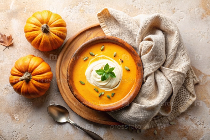 Традиционный мягкий тыквенно-кремовый суп с сливками и семьями тыквы на бежевом бетонном фоне