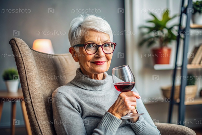 Современная, стильная пожилая женщина с короткими волосами со стаканом красного вина на стуле в гостиной дома