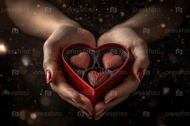 Руки женщины с подарком в форме сердца с шоколадом на День святого Валентина