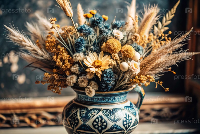Красивый букет сушеных цветов в керамической вазе на древнем деревянном шкафу. Букет цветов в вазе во внутренней части дома. Светлый, бежевый, синий цветочный фон