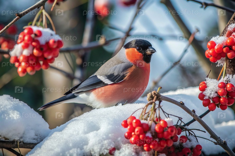 Милая красочная евразийская бульфинга, сидящая на ветке и питающаяся ягодами красного пепла