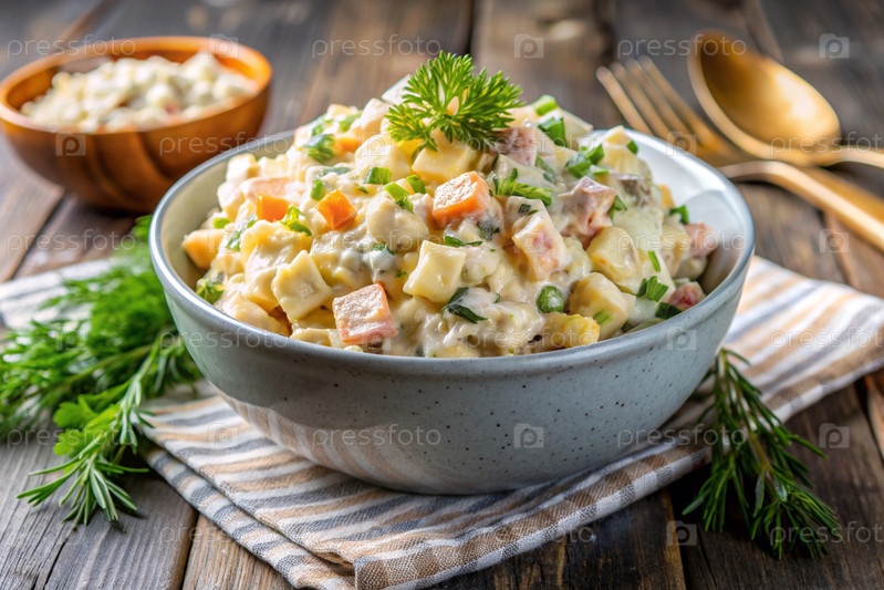 Традиционный русский салат Оливье для празднования на тарелке на деревянной столешнице. генератив AI