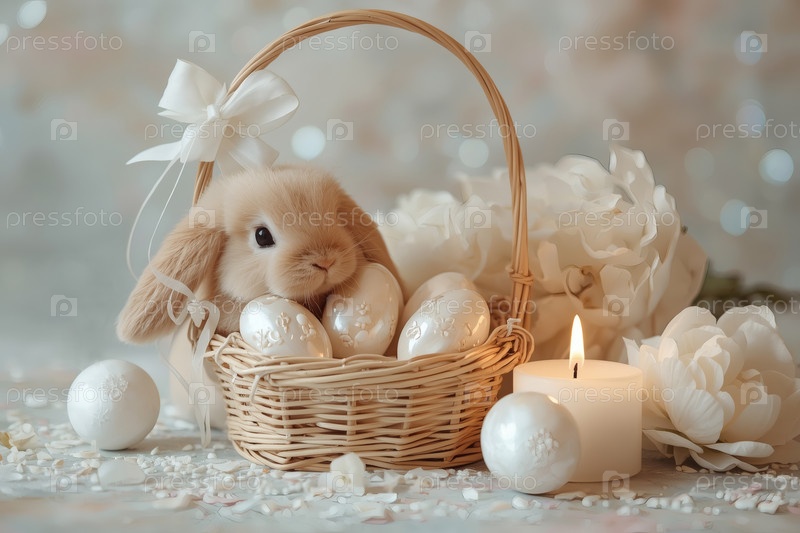 Концепция счастливых пасхальных праздников: нежные жемчужинные яйца в корзине, кролик и деликатные цветы на пастельном фоне