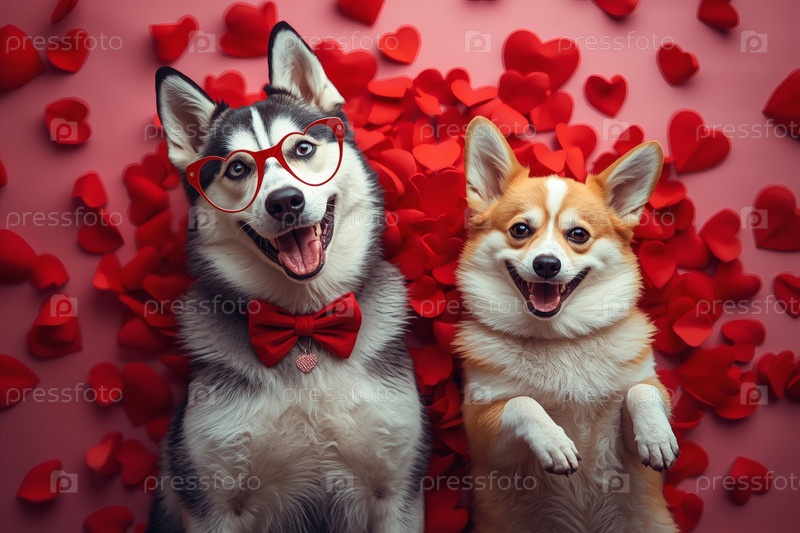 Красивый баннер на День святого Валентина с влюблёнными собаками и красным сердцем. Вид сверху. Романтическая и любящая атмосфера