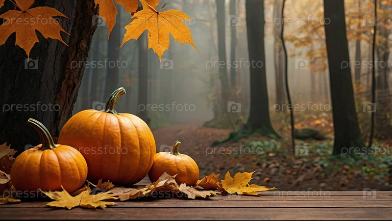 Осенний фон тыквы и осенние листья на фоне леса. Концепция Хэллоуина