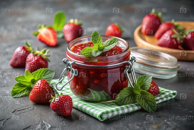 Банка домашней клубники, здоровый варенье с мятой на черном фоне.Сохранение и уборка летом