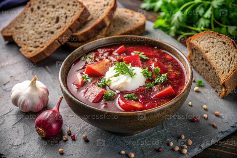Традиционный украинский и российский борщ в стильной керамической тарелке с травами, сметаной и чесноком