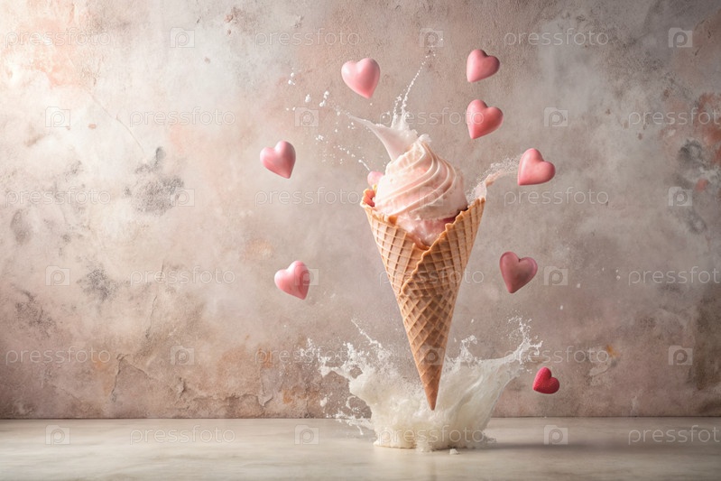 Сладкий десерт. Любовь к мороженому. Сердечно-образный конус мороженого с брызгами, сердцами и пятнами. Концепция Дня святого Валентина. Баннер, реклама