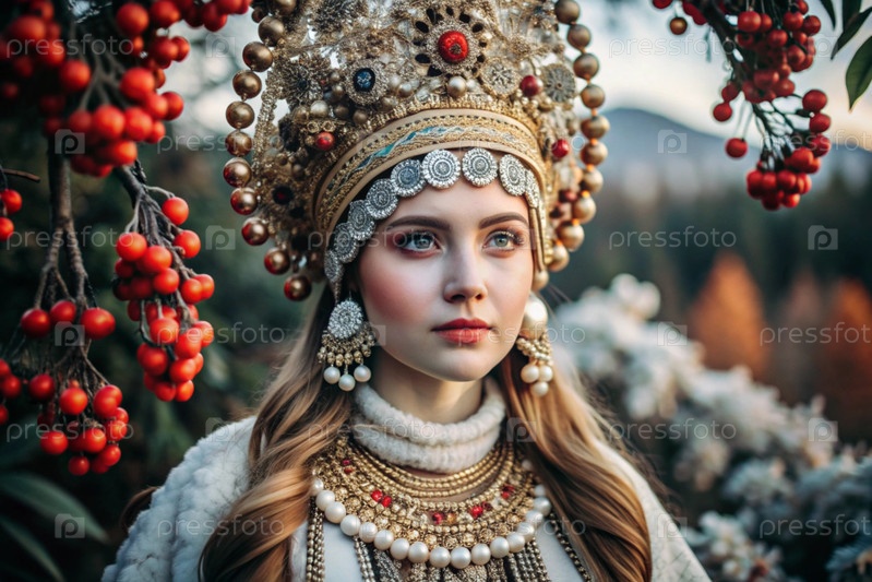 Красивая девушка в традиционном русском национальном костюме. на фоне елок. портрет символизирует традиции и красоту русского народа