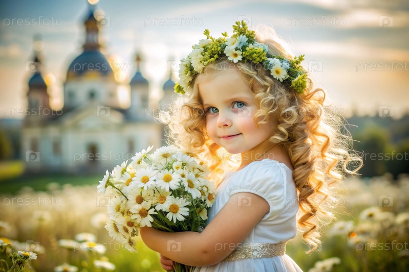 Всероссийский День семьи, любви и верности Красивая маленькая кудрявая девочка с букетом ромашек на фоне Православной церкви День святого Валентина Петра и Февронии