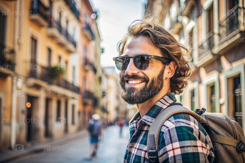 Портрет счастливого красивого хипстера-путешественника с рюкзаком и солнцезащитными очками. Сольное путешествие, образ жизни. Молодой турист наслаждается отдыхом в солнечный день