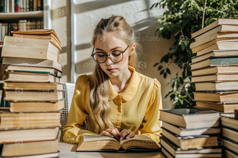 Чтение, подготовка к экзаменам. Прием в колледж. Молодая девушка с очками среди многих книг во внутренней части гостиной, сидящая дома под естественным светом