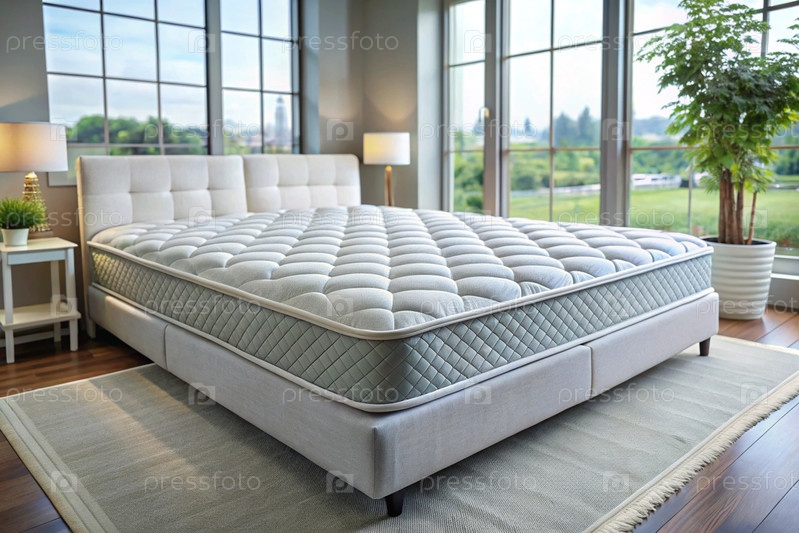 Новый белый роскошный комфортабельный ортопедический матрас на кровати в светлой спальне