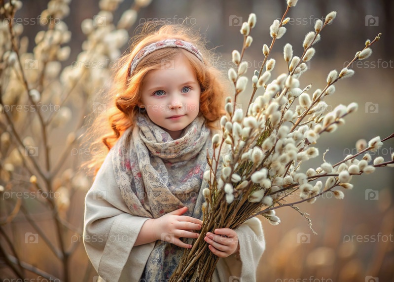 Пальмовое воскресенье. христианство. портрет трехлетней девочки в русском народном шале с ветвями ивы в руках на фоне цветущей ивы