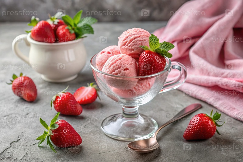 сладкий десерт. любовь к мороженому. клубничные шарики с мороженым в стеклянной таре и свежие ягоды. баннер, реклама